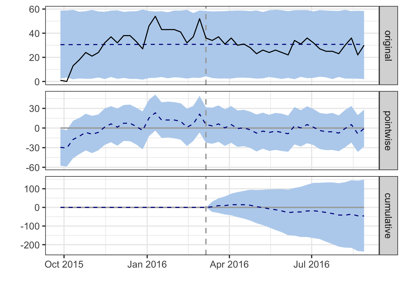 impact <- CausalImpact(upgrades_ts, pre.period, post.period, model.args = list(niter = 5000))