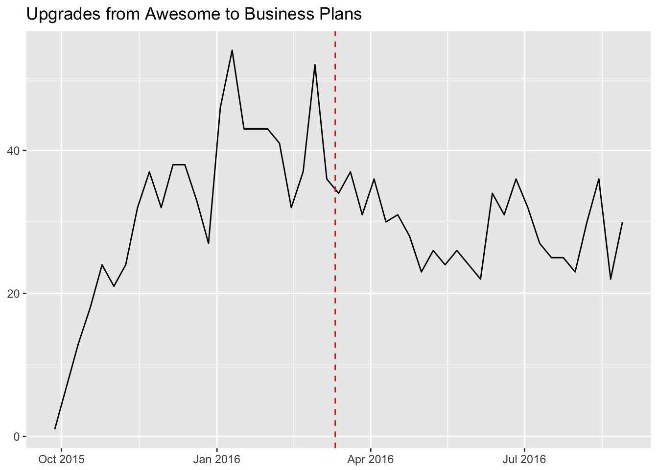 We can use the CausalImpact package to estiamte the effect that the price change had on upgrades to Business plans from customers that were previously on Awesome subscriptions.
